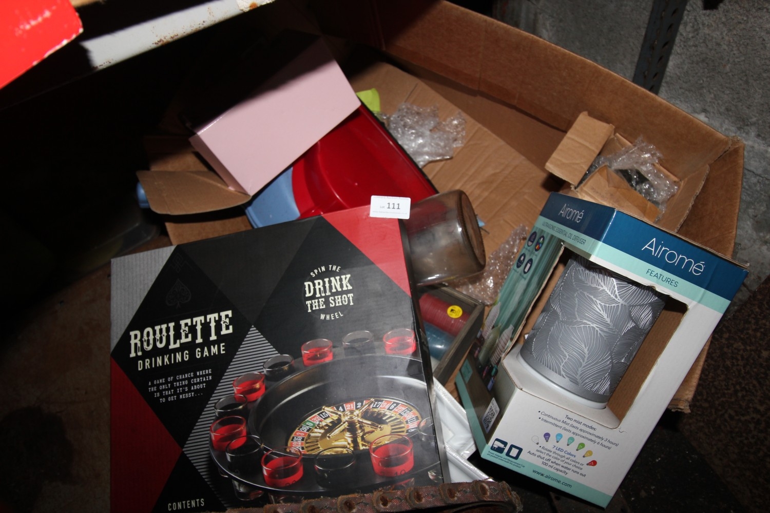 A box of misc household inc boxed "Spin the Wheel Drink the Shot" roulette drinking game, new boxed Airome ultrasonic essential oil diffuser and much more