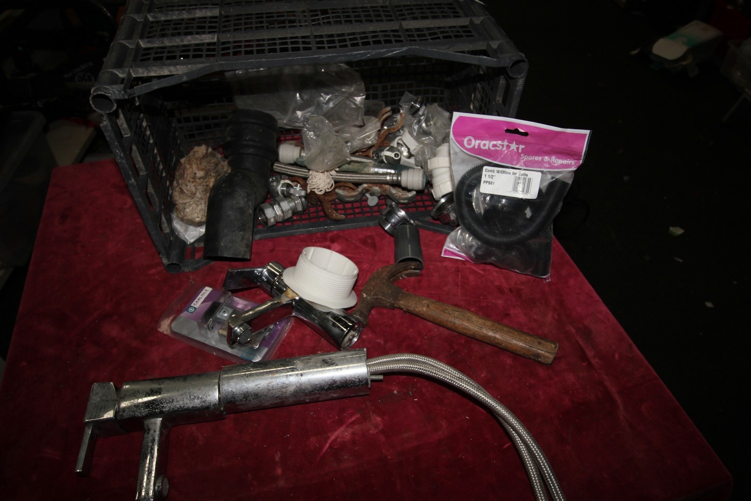 Lot 114: Crate of misc hardware inc plumbing flexible tap...