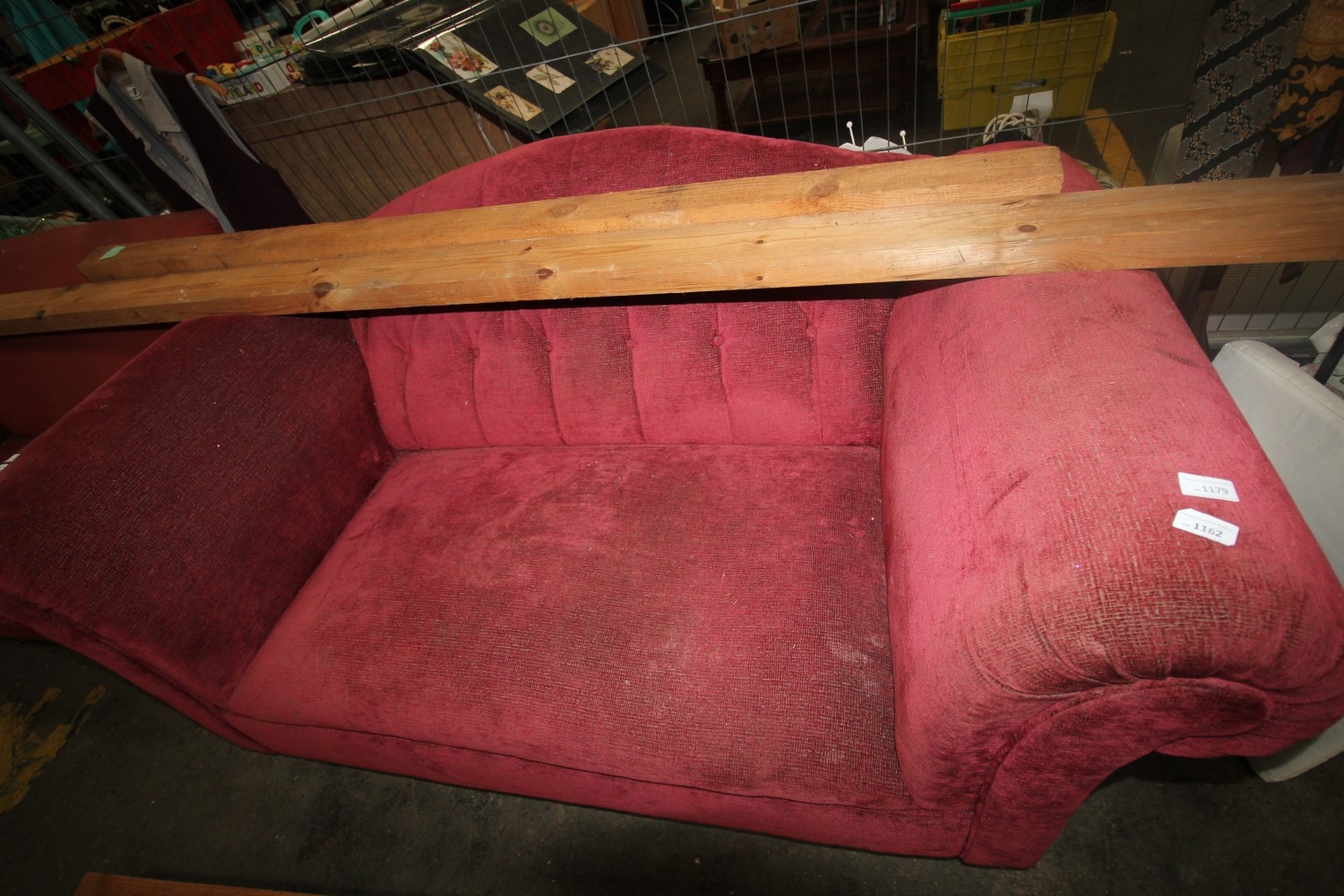 A MID CENTRY SMALL ARCH-TOP BUTTON-BACKED TWO SEATER SOFA FINISHED IN WINE RED