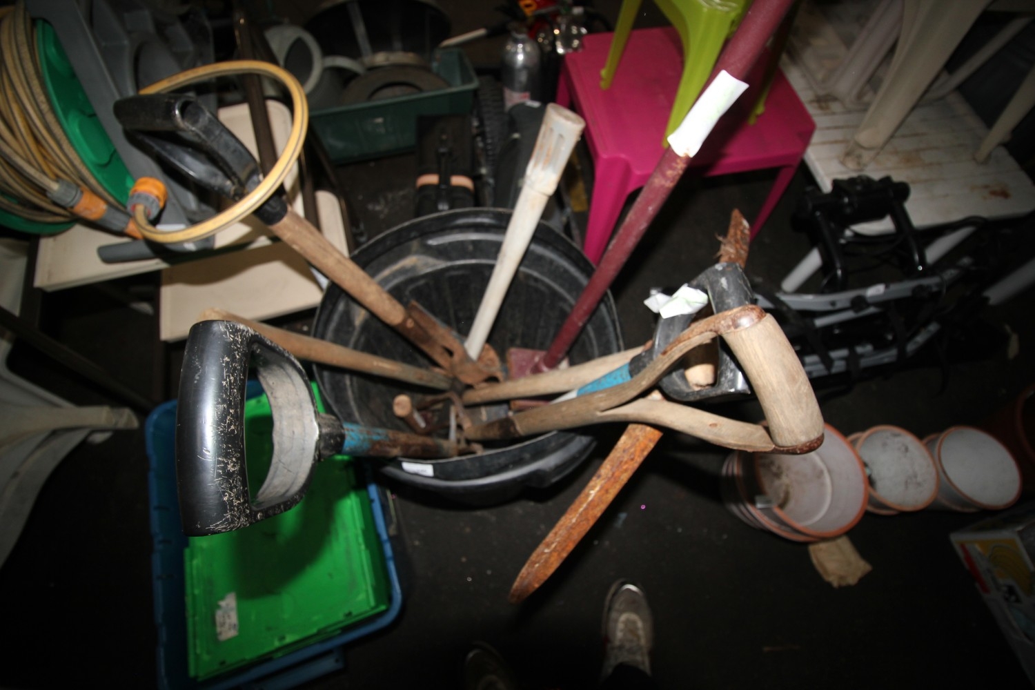 Black plastic dustbin and contents – pickaxe, tarmac tamping iron, garden forks, shovel, nylon-handled mattock, lump hammer etc.