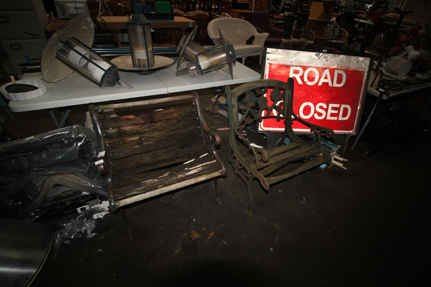 Two vintage cast iron ended garden seats, one also has a rose-motifed cast iron back. Timber is present on both but will need replacing.