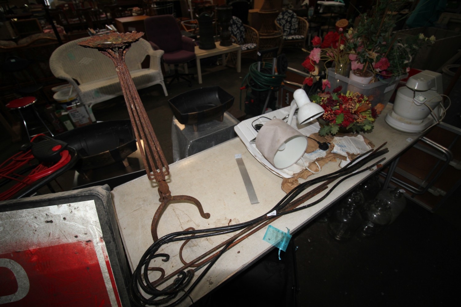 Selection of wrought iron garden lighting items inc seven ground spike lantern / lamp hooks and a vintage iron candlestick holder