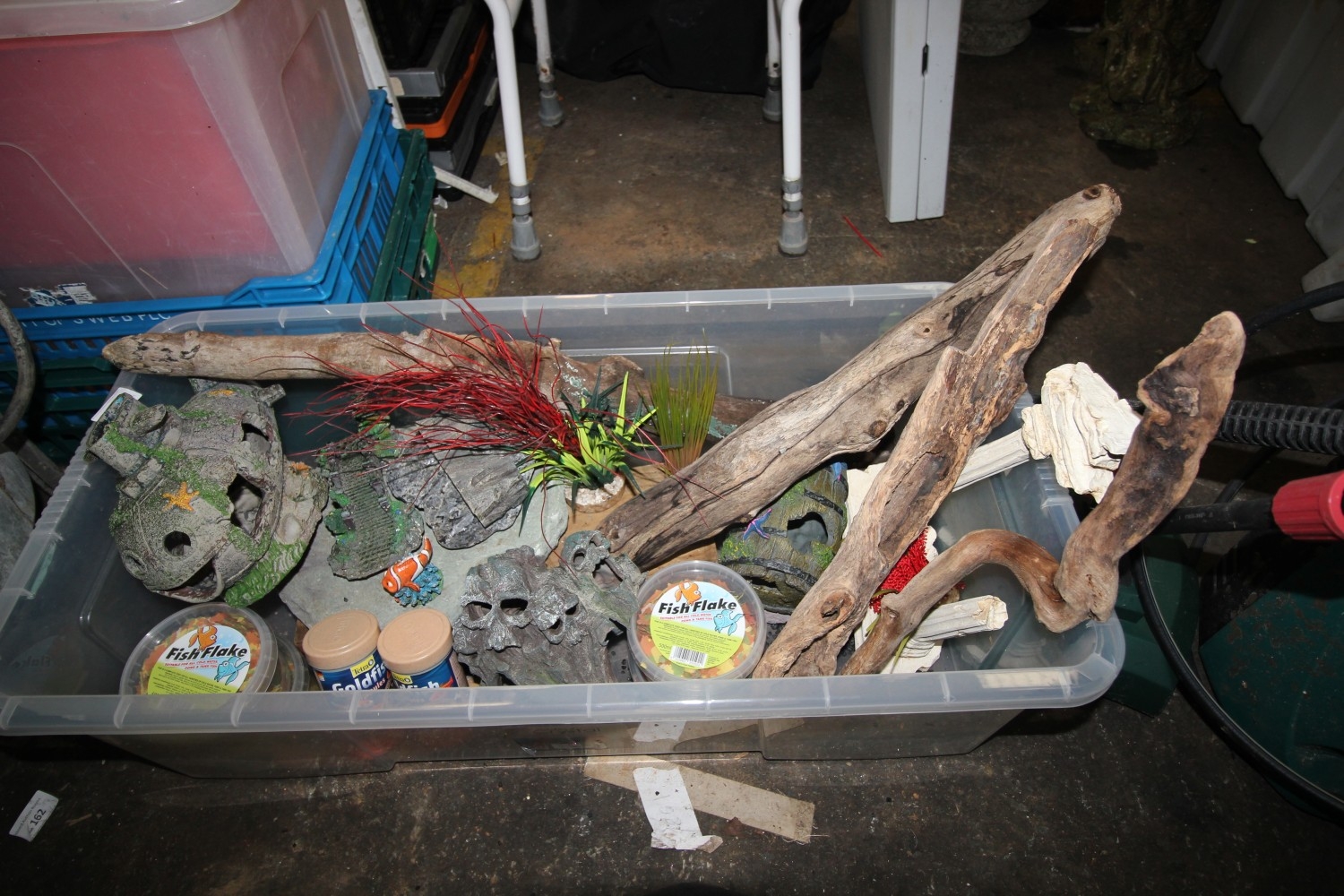 Large quantity of aquarium paraphernalia inc. many fish tank ornaments, bog-wood, stones etc