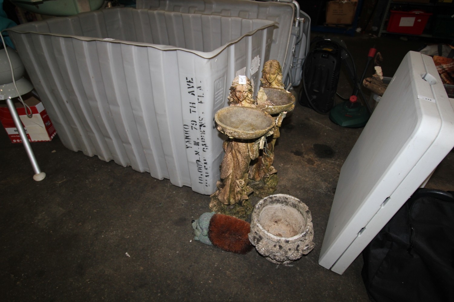 Two 60cm tall female garden statues (one af) plus a concrete Greek urn style planter