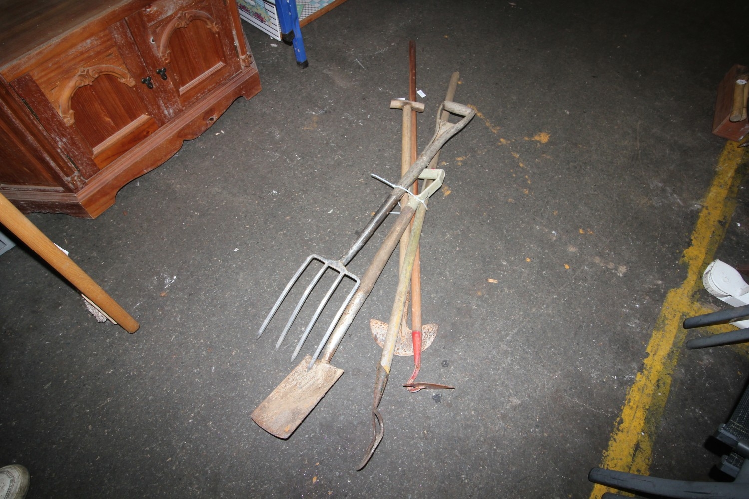 A selection of garden tools inc stainless steel garden fork, hoe, edger, spade etc
