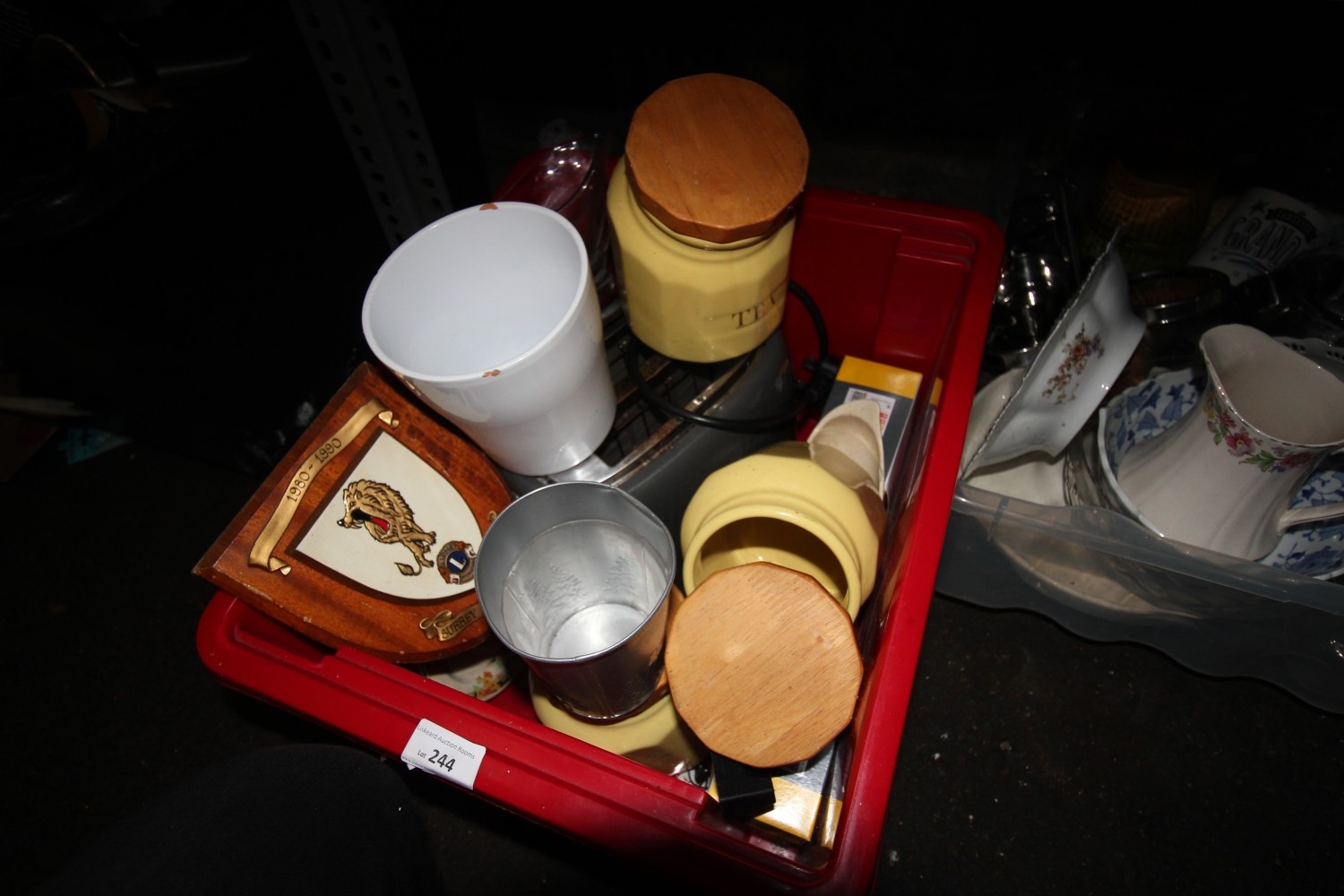 A plastic tub of misc household items inc tea, suger and coffee pots, 1980’s commemorative wall plaque, toaster and more