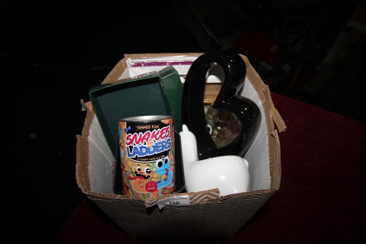 A box of household inc hampton and co photo frames, snakes and ladders tin game, gloss photo printer paper and more