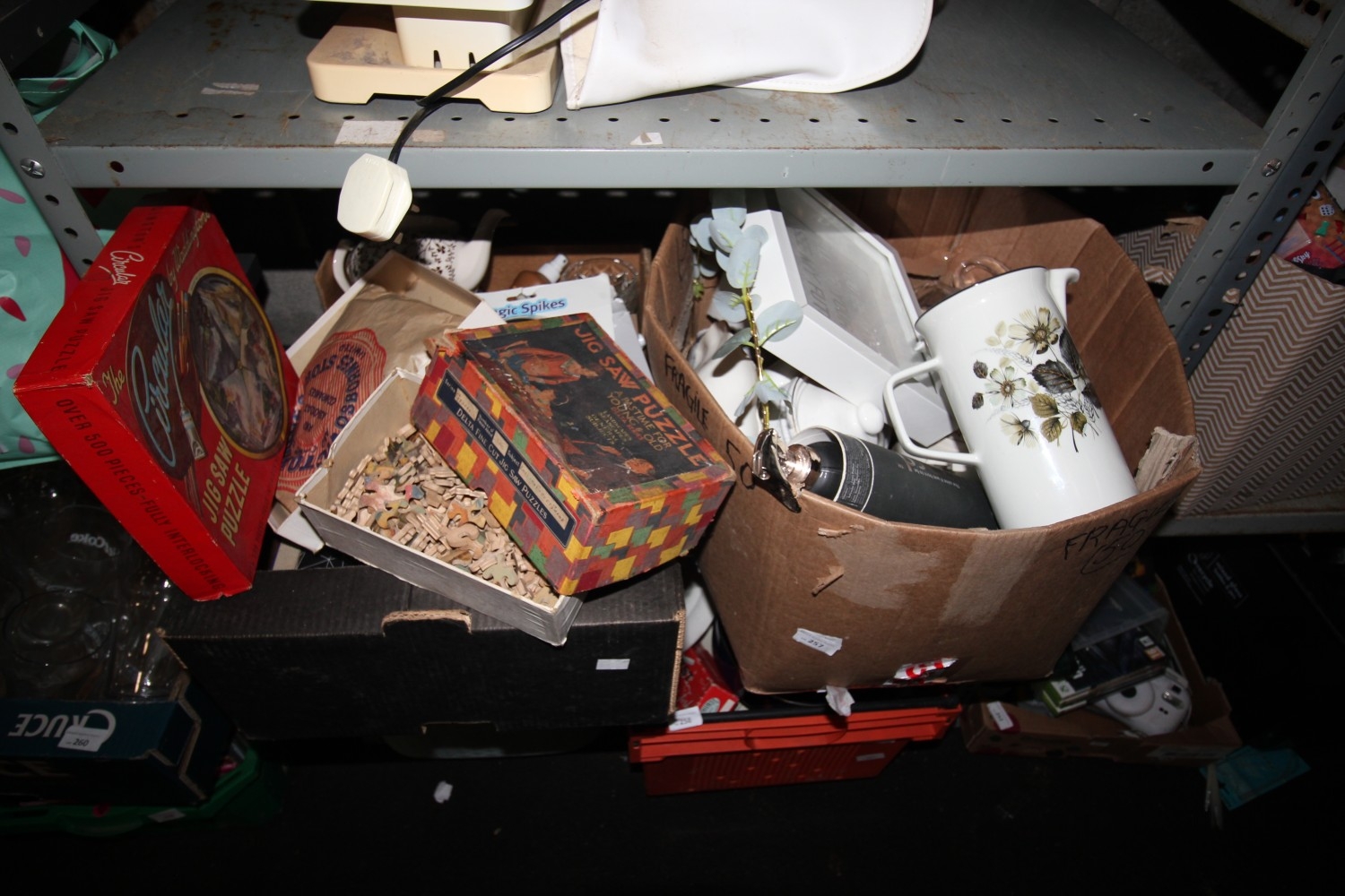 3 x containers of mixed household – electric can opener, picture frames, electric hand held sewing machine, Johnson Bros teapot and jug, Royal Doulton, Adler decorative plate, Staffordshire plates and more