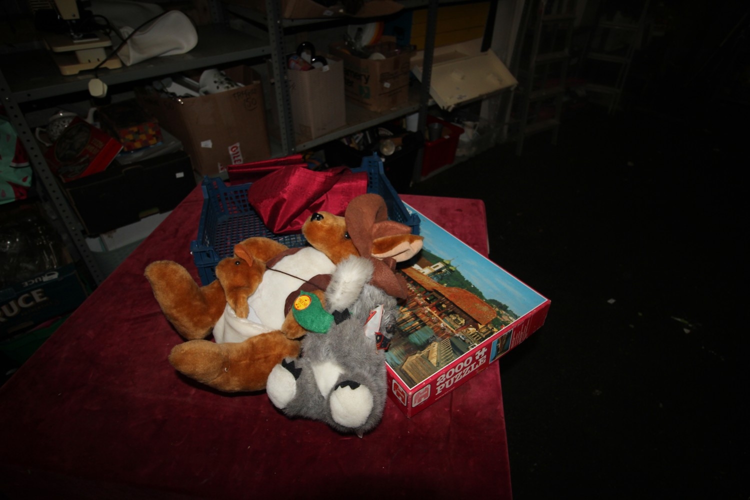 A crate of misc inc new mattress protectors, soft toys, jigsaw puzzle and a badminton racket by challenge pro