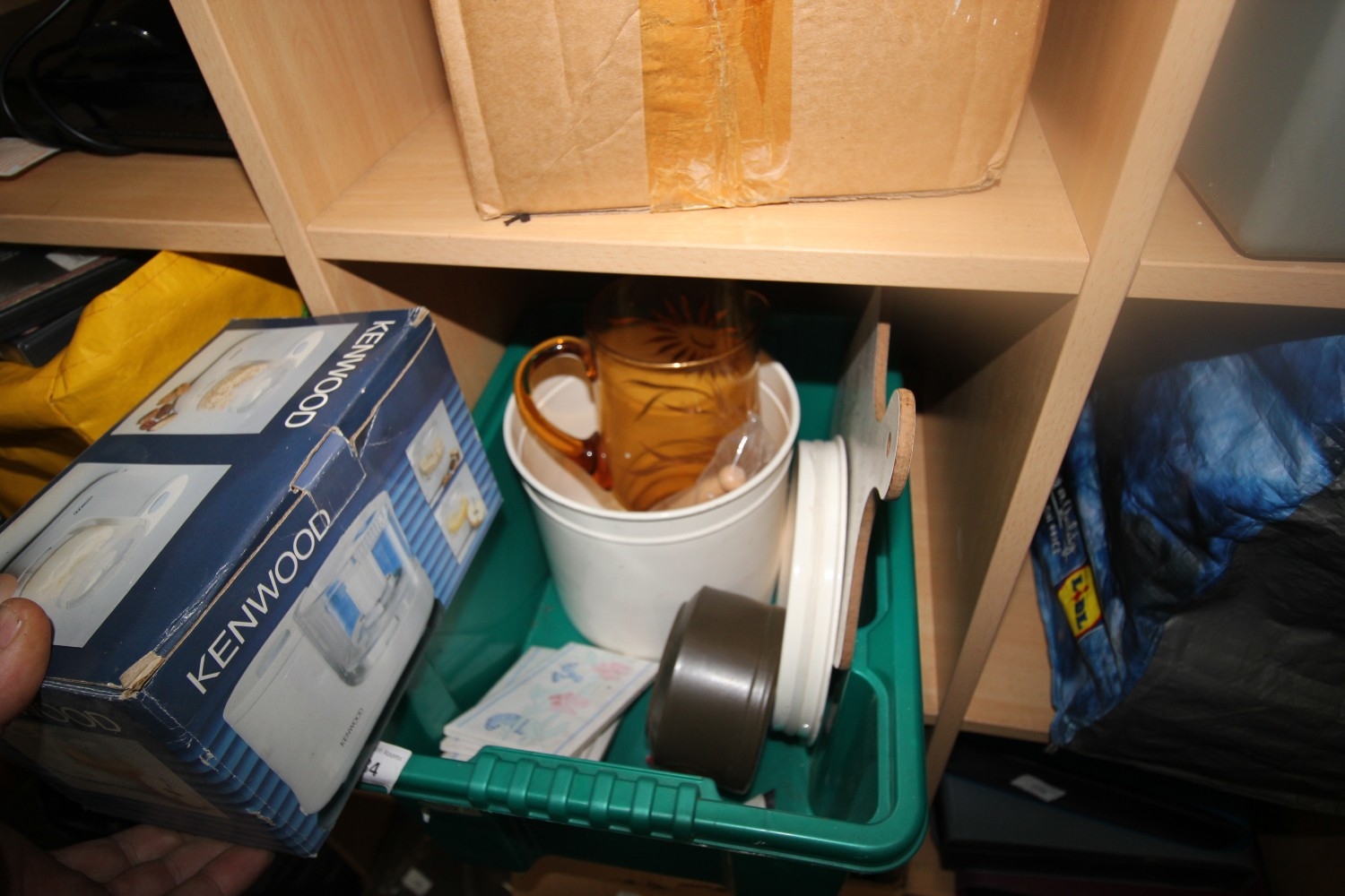 Mixed box inc hand-made paper flowers, Crown Clarence ironstone Agincourt trinket pot, retro amber glass jug and more