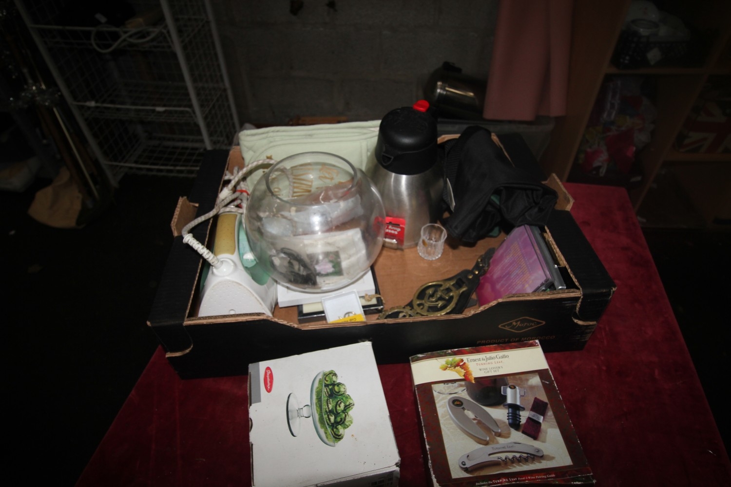 Mixed box of household inc. iron, horse brasses, Toscana bonbon dish, glass bowl and more