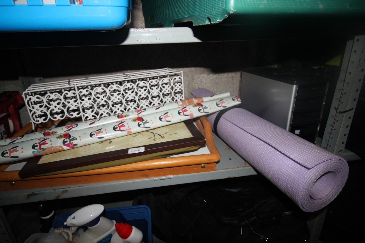 Lot 322: shelf of miscellaneous item inc yoga mat, wrapping...