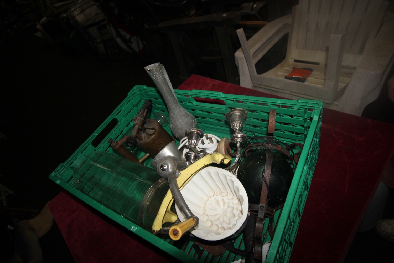 misc box in stockolm decorators blow lamp benzolene & petrol only, steal yellow painted meat grinder and many many more