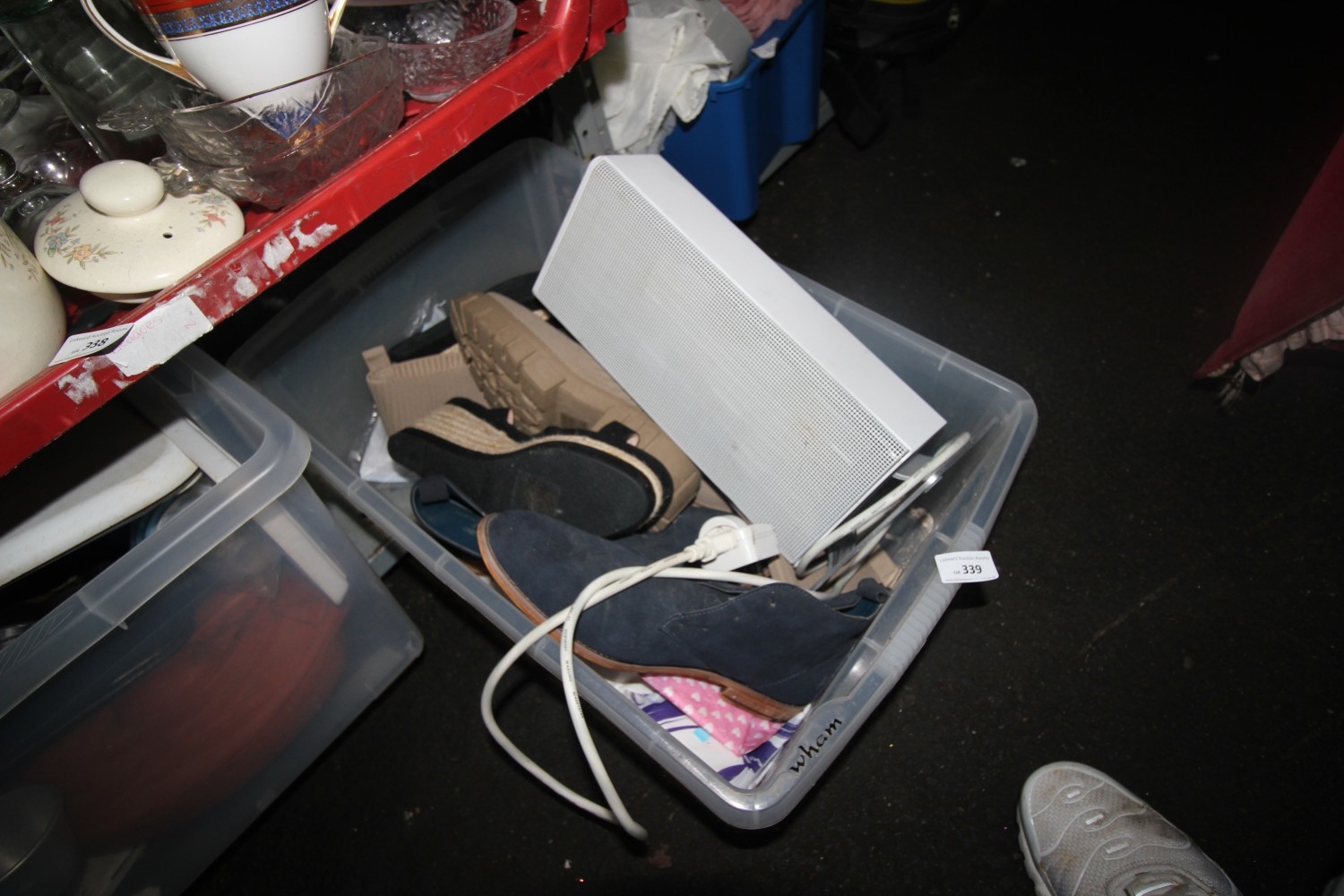 a box inc a mini desk heater/air conditioner unit plus shoes inc mens size 10 unlased smart shoes ect