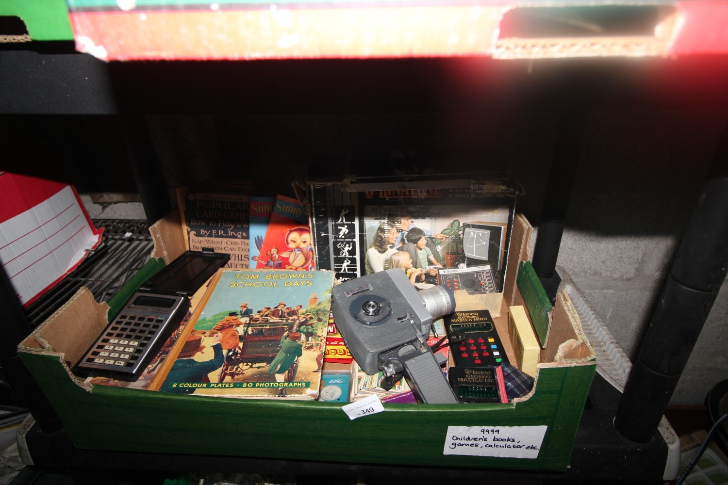box inc vintage cine camera, vintage childrens games, books, calculators