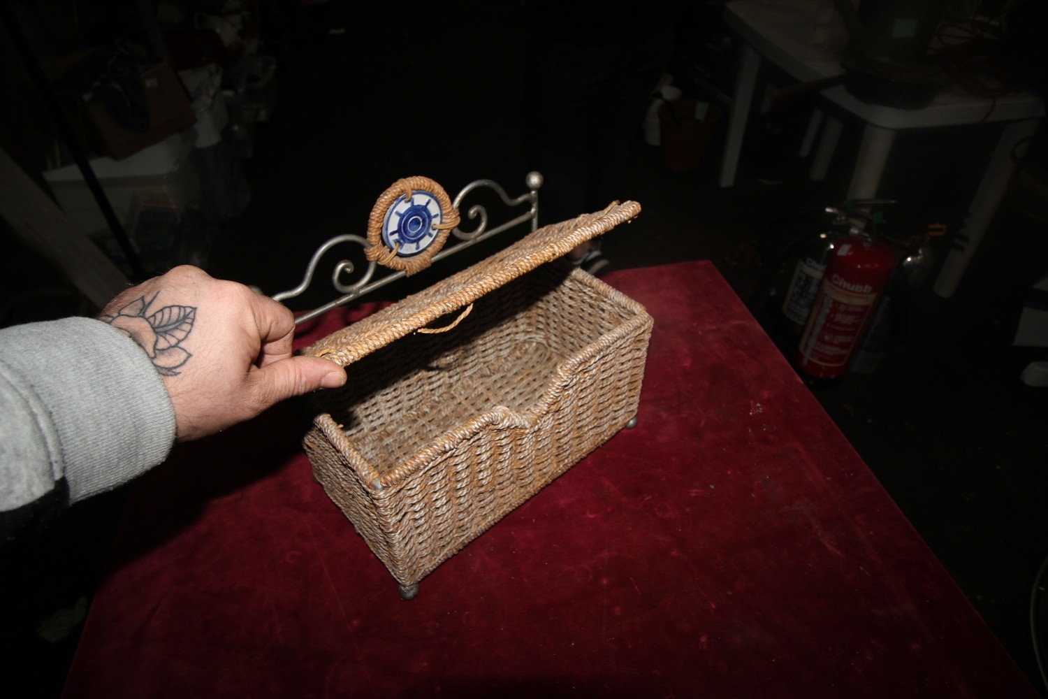 Metal framed ceramic and hessian roped bathroom basket – perfect as a loo roll holder