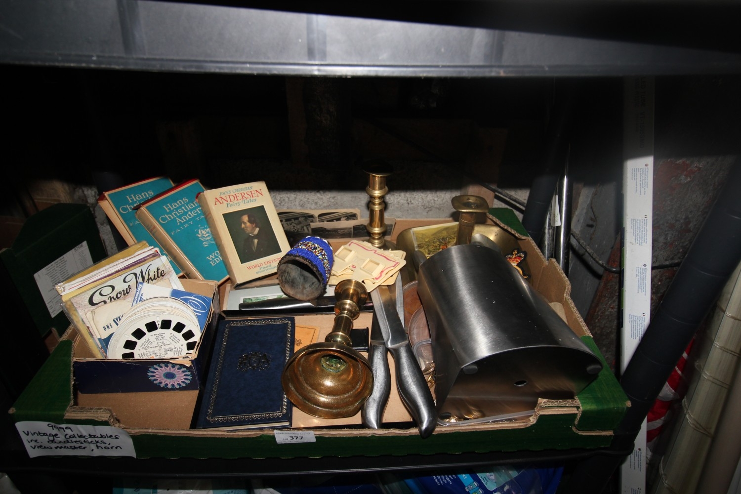 Lot 377: vintage collectables inc candlesticks, view master, horn etc