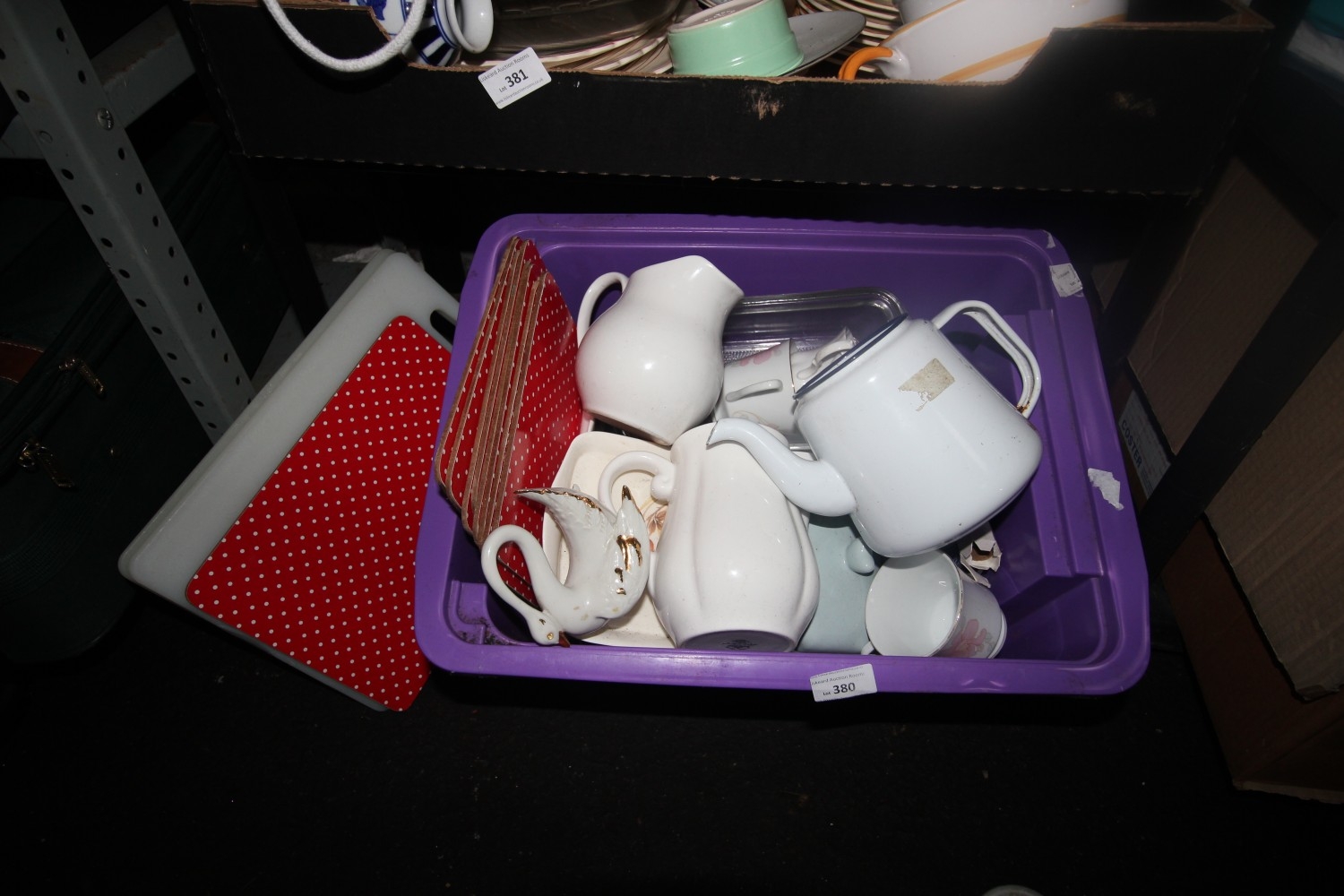 Lot 380: Large plastic tub of kitchenalia inc. enamelled teapot,...