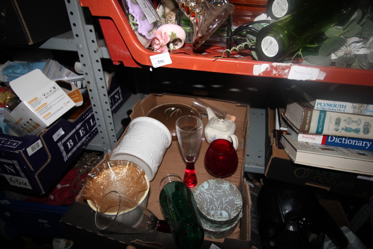 Lot of mixed china and glassware inc a pair of vintage Artland Prescott ruby stemmed champagne flutes, cranberry brandy glass, ruffled Carnival glass dish, vintage teapot, vintage Empoli green Wrythen glass and more