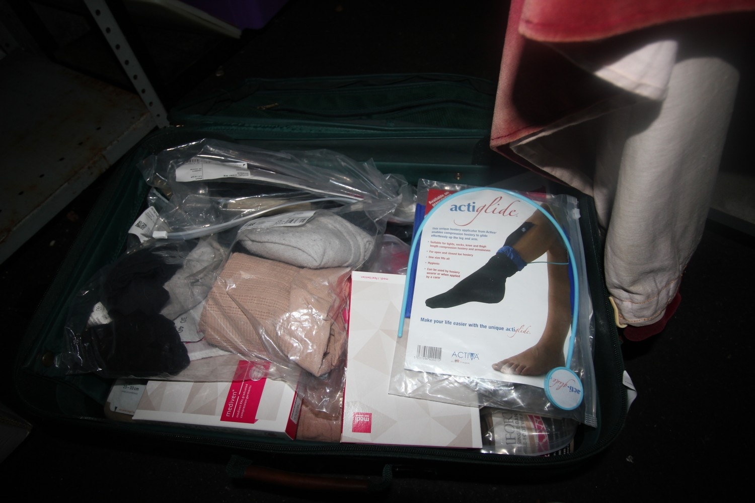 Jaguar branded suitcase containing a large collection of medical compression garments