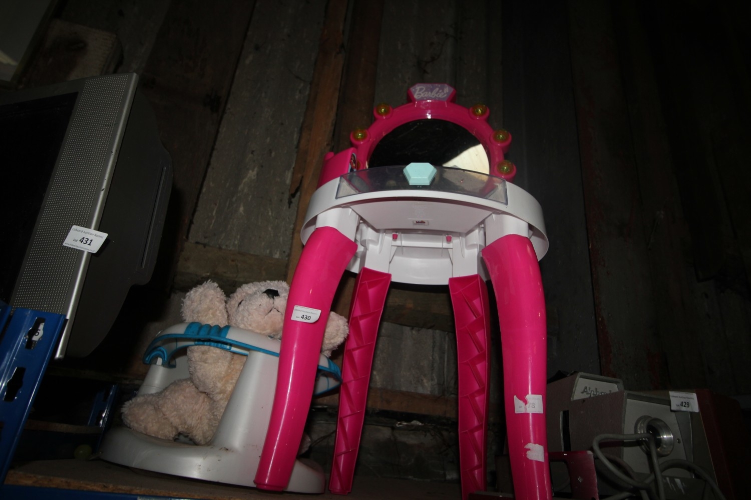 Lot 430: CHILDS BARBIE DRESSING TABLE, SEAT BUMPER AND TEDDY
