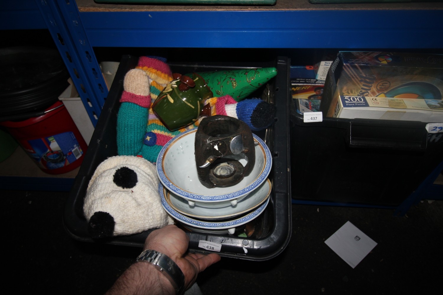 Lot 438: Large recycling tub containing a handmade woollen Teddy,...