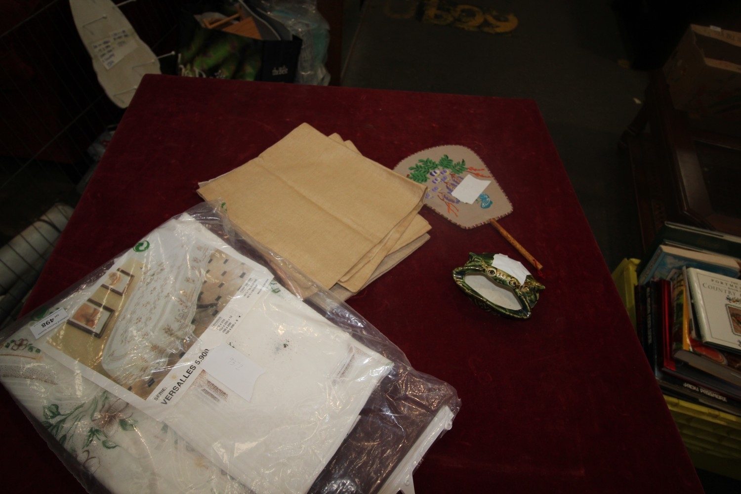 selection of textiles inc table cloth, hand fan and crab trinket dish