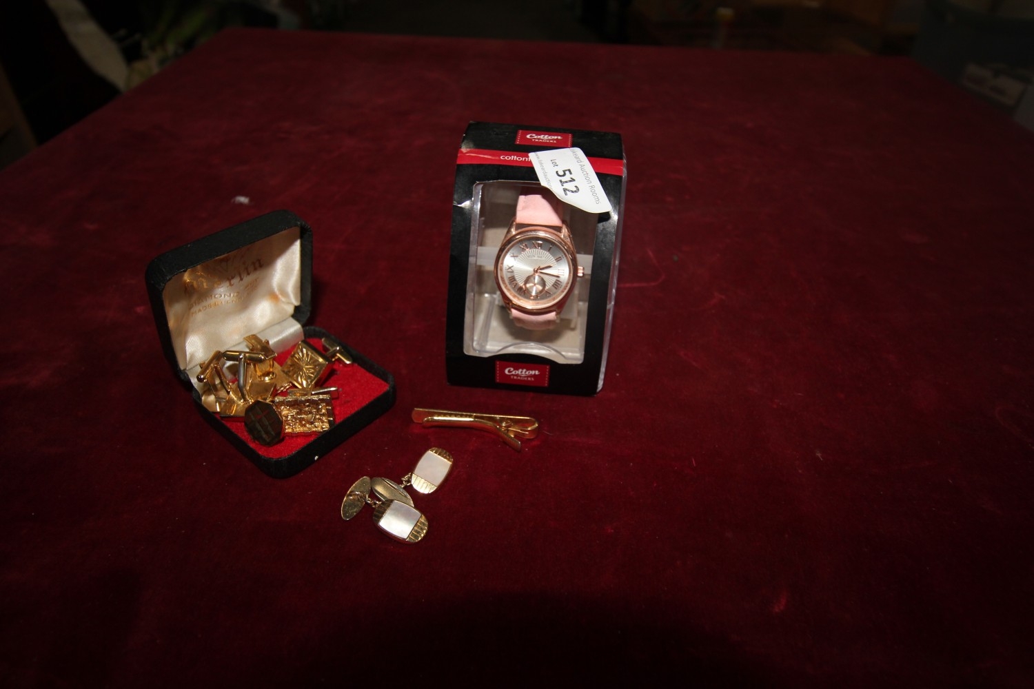 boxed ladies cotton traders rose gold watch with pink strap and a box of gold tone cufflinks