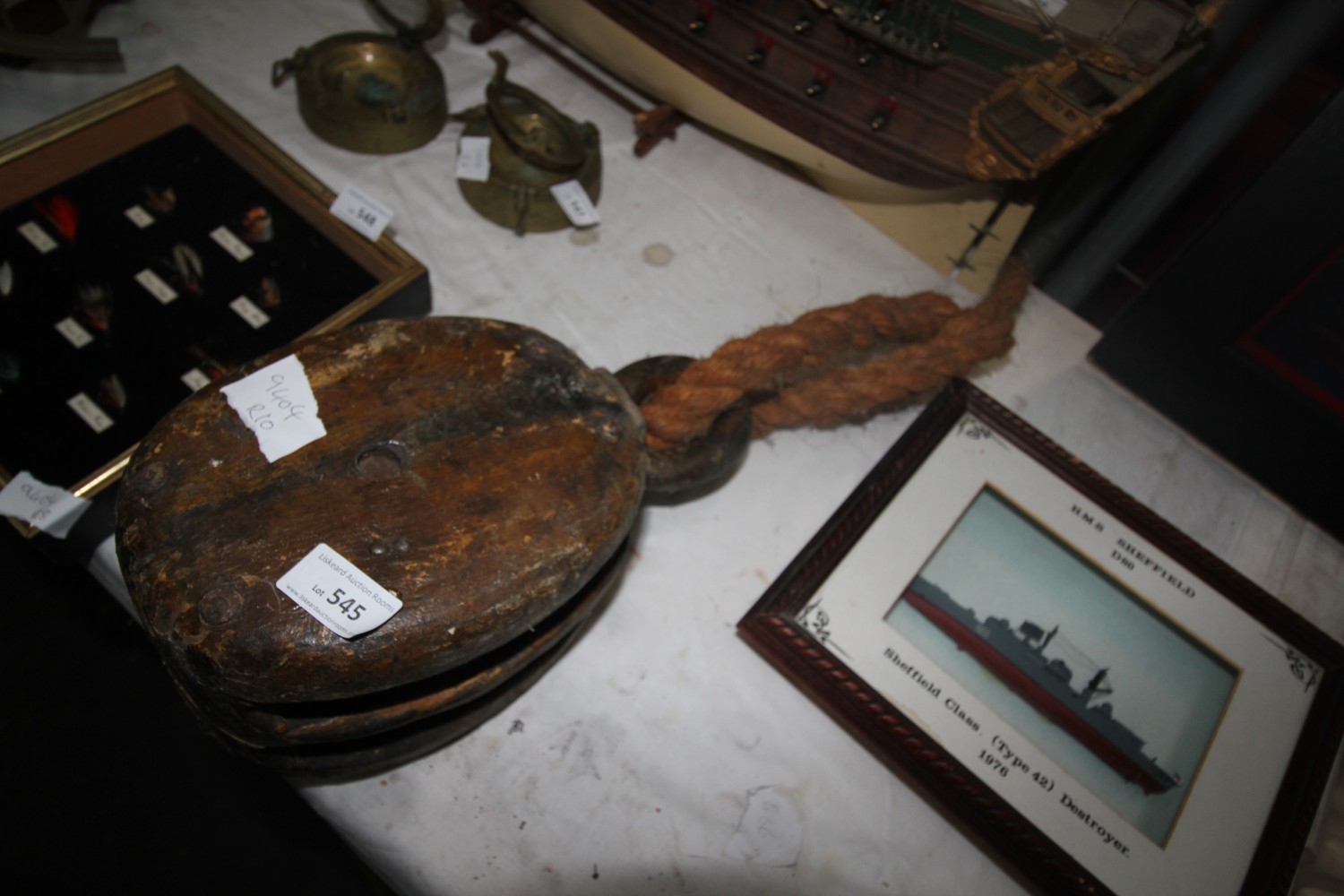 Lot 545: Antique twin wheel oak and steel maritime pulley...