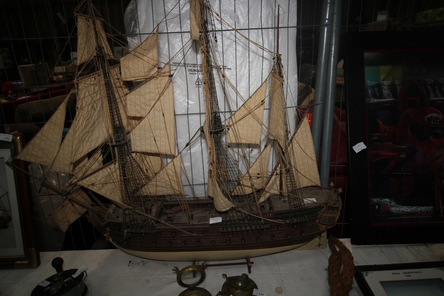 Large vintage model of a three-masted Danish sailing ship. Measures 90cm tall by 104cm long approx