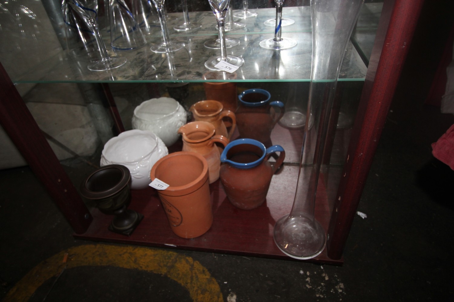 Selection of mixed pottery and glassware inc tall glass vase, terracotta wine cooler and jugs, glazed pottery goblet and white glazed plant pot