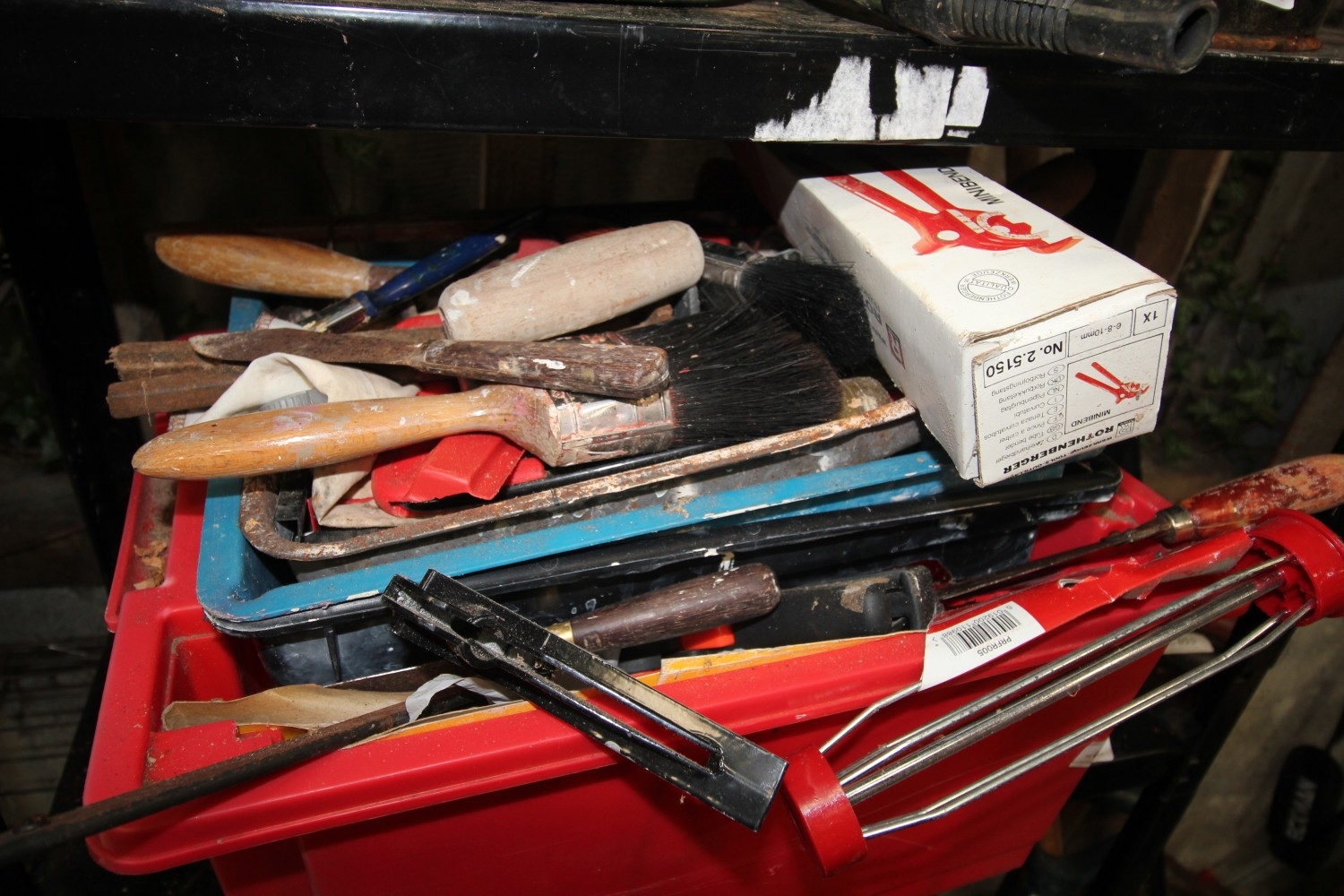 A large tub of misc hand tools and hardware inc paint brushes, rollers, filling knives, scrapers, paint trays, brick trowel, pointing trowel, putty knife, plastering trowel and more