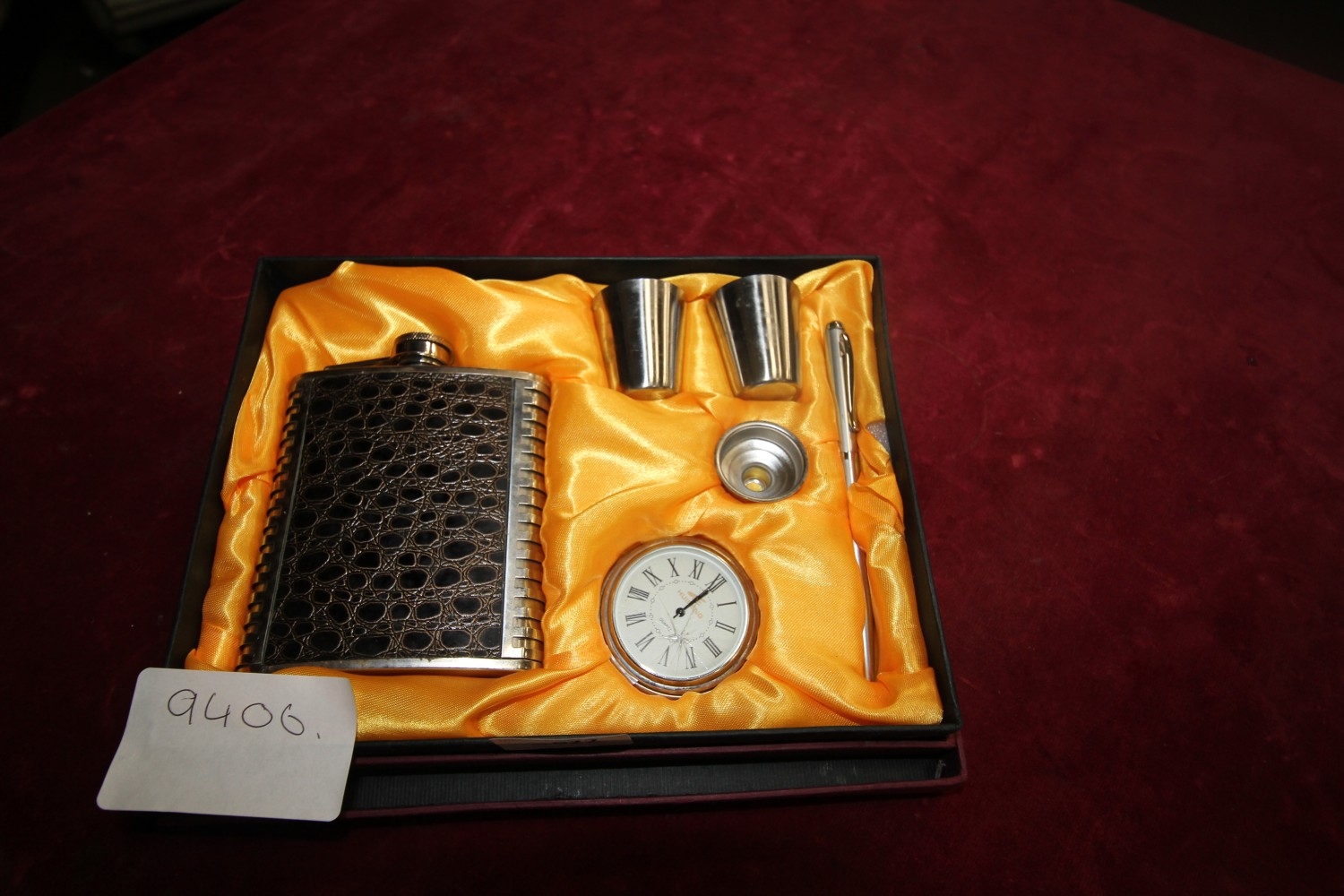 vintage hip flask set with matching cups and filling funnel