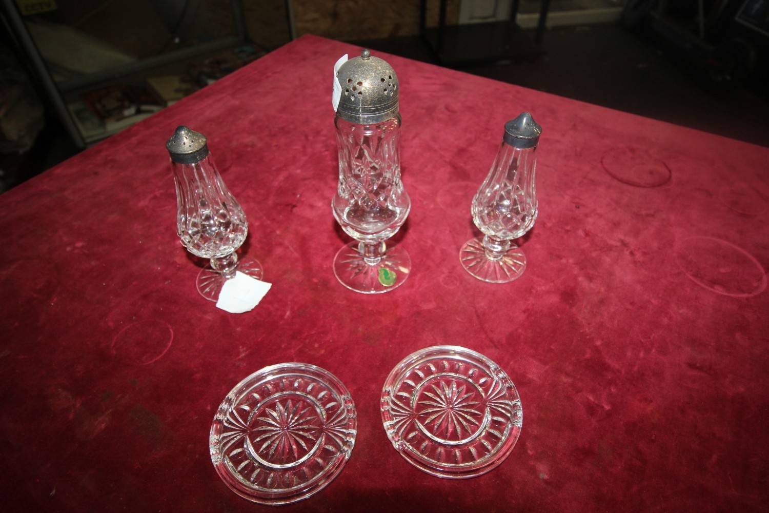 set of 3 waterford crystal lismore footed salt, pepper and sugar shakers with 2 coasters
