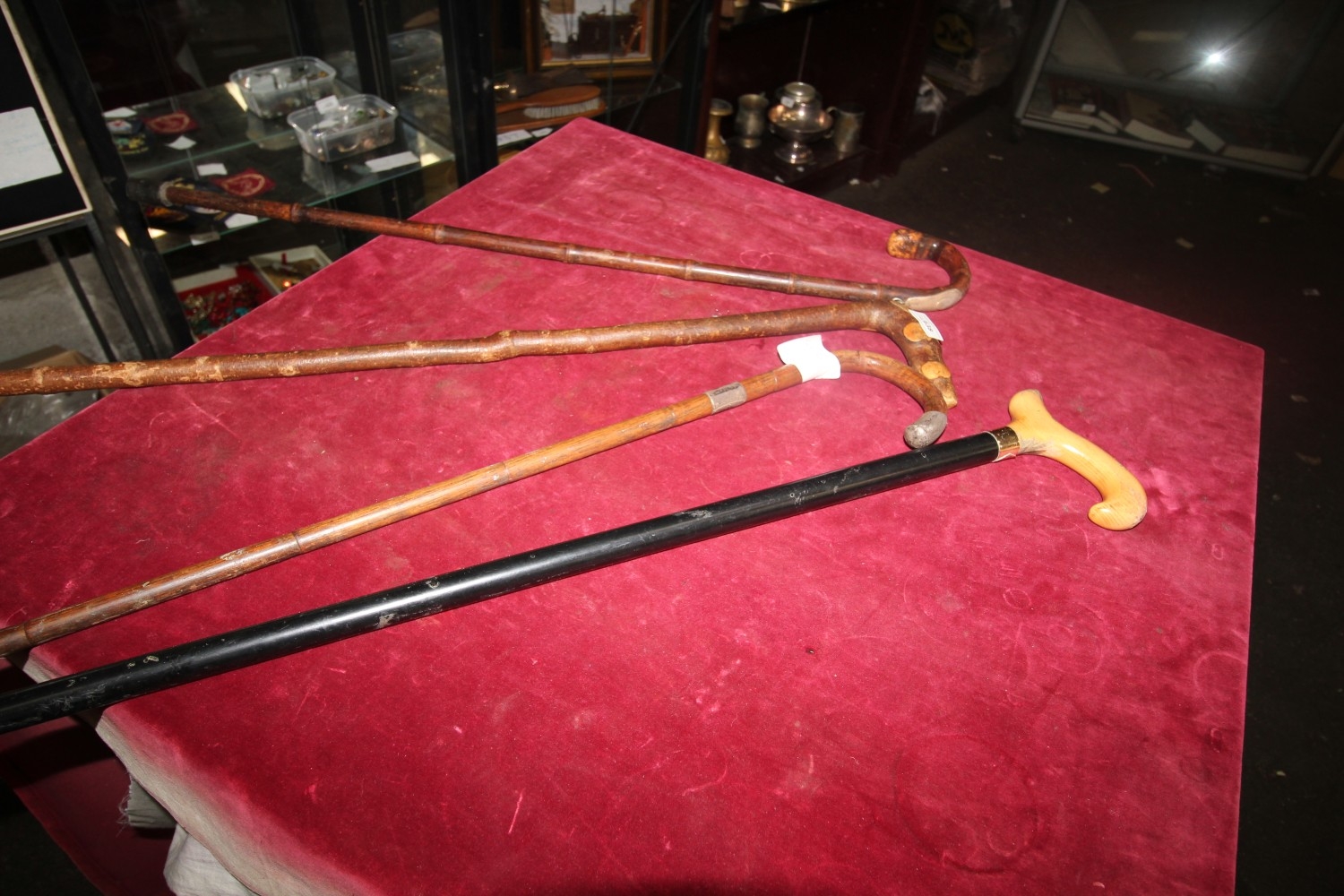 selection of 4 vintage carved walking sticks including Brigg walking cane with hallmarked silver adornment, monogrammed silver collared and tipped cane dated 1921 plus two others