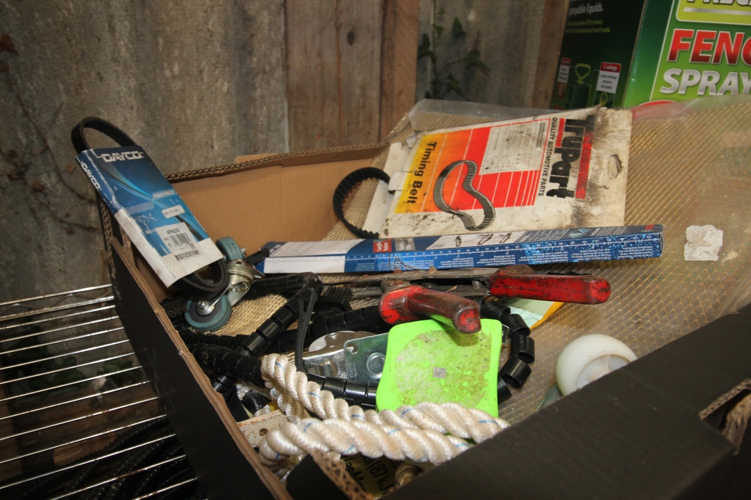 Large box of misc hardware in quality slate cutters, tape measure, new castor wheels, nautical rope, metal gauze and more