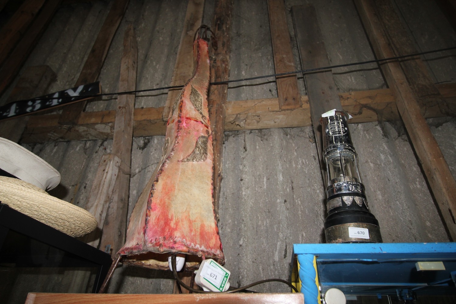 Lot 671: Interesting wirework and stitched hide lamp measuring 100cm...
