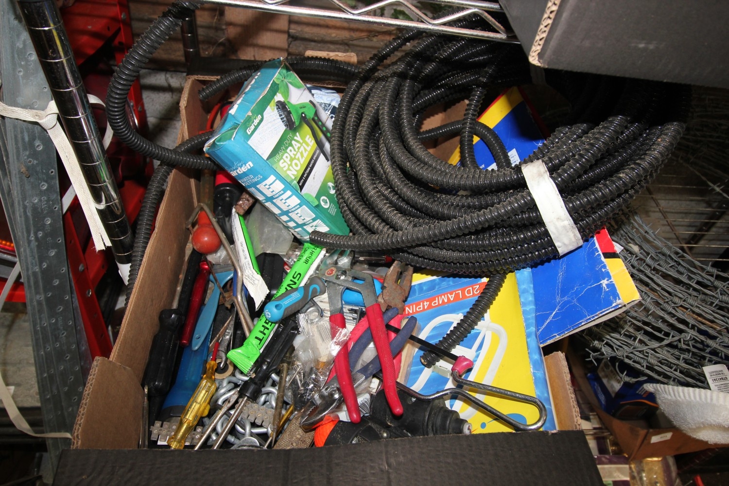 A large box containing Black and Decker battery and charger, long length of quality reinforced pond hose, tools, sandpaper, plumbers grips, pliers, screwdrivers, and lots more