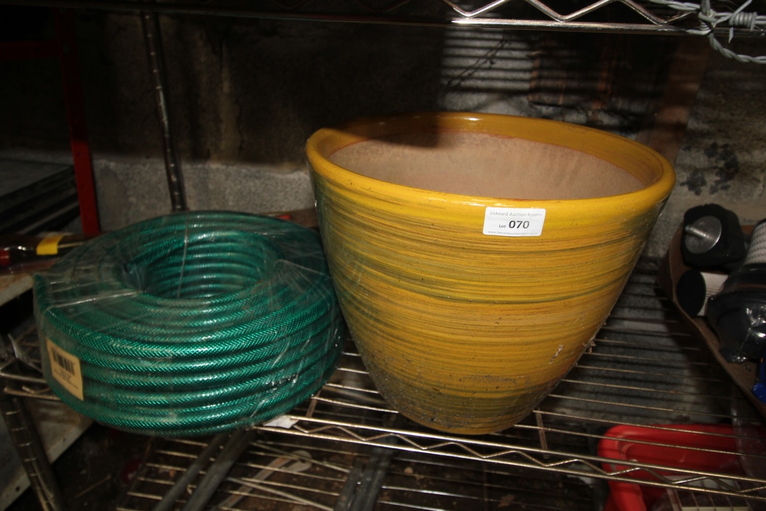 Shades of olive glazed terracotta plant pot – 28cm tall and 32cm in diameter plus a new 30m length of reinforced garden hose
