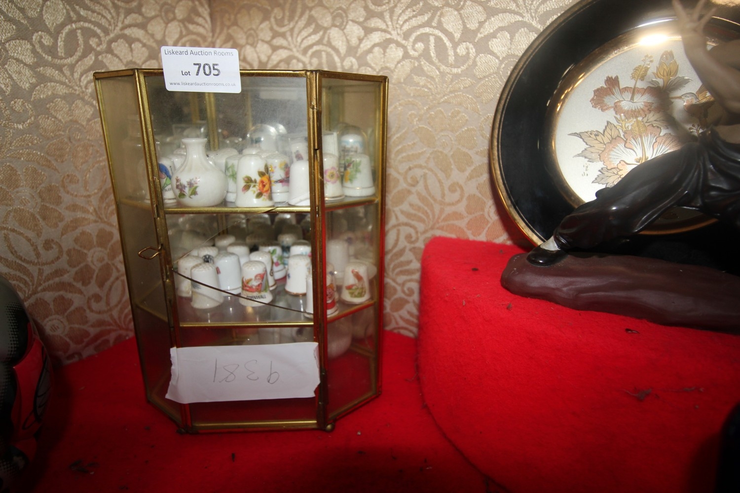 mini three shelf display case containing a number of trinkets – thimbles, miniature vases, teacup etc
