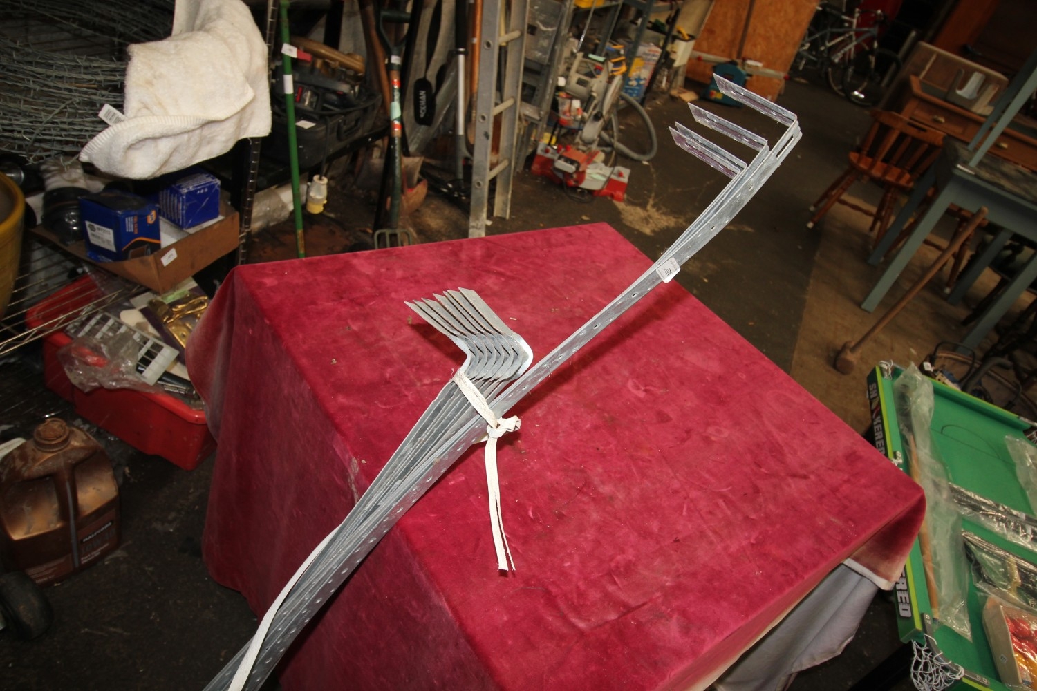 Selection of zinc galvanised tie-down straps: 7 at 110cm long and 4 at 150cm. used for holding down wall-plates, timber-frame building etc