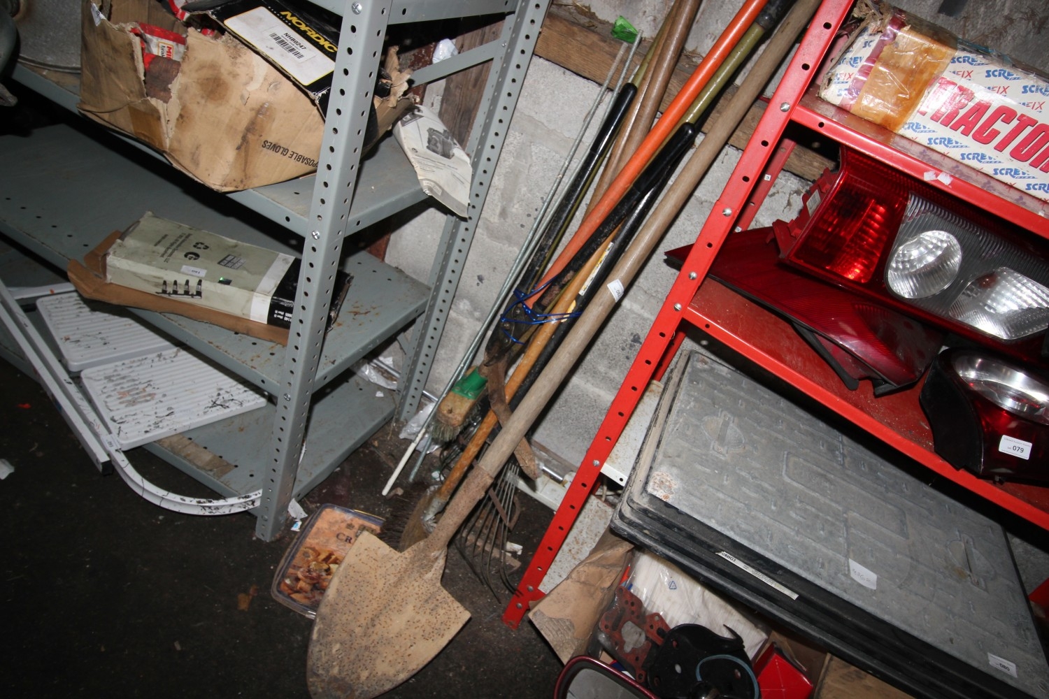 Selection of gardening tools inc long handled shears, Cornish shovel, lawn rake, brooms etc