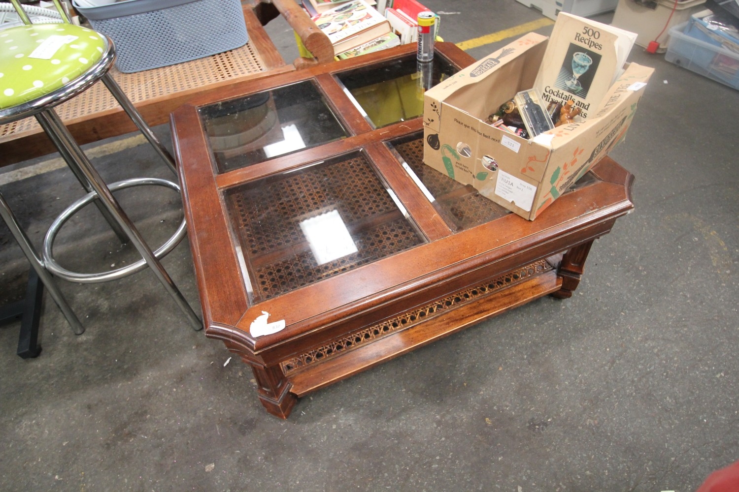 vintage mahogany square coffee table 95cm x 95cm with glass panelled top, woven detailing shelf and ornate carved legs