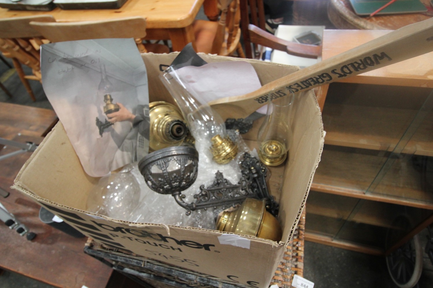 Lot 843: A BOX INCUDING 2 BRASS WALL LAMPS WITH...