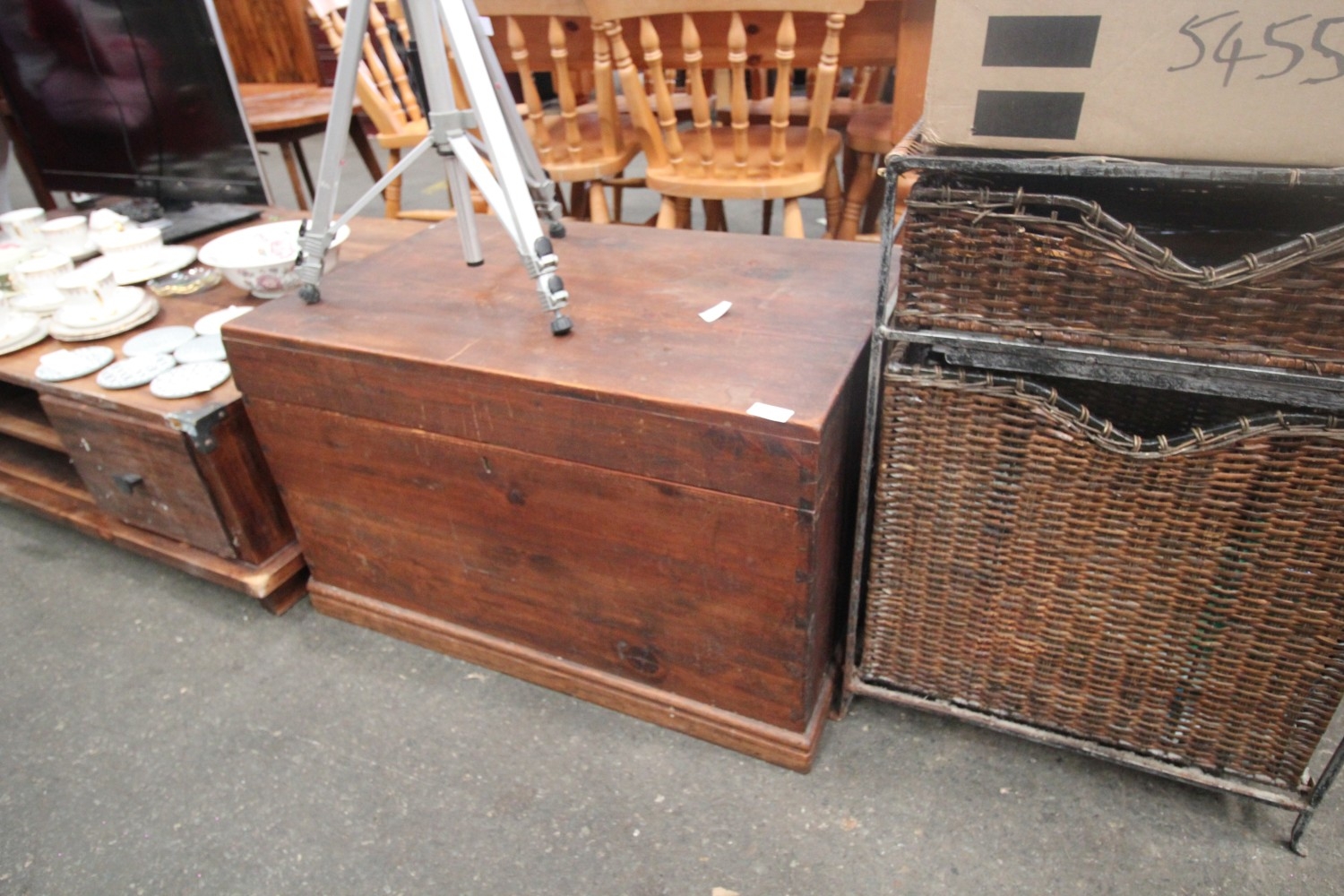 Lot 846: Vintage dovetailed pine chest with brass fitments in...