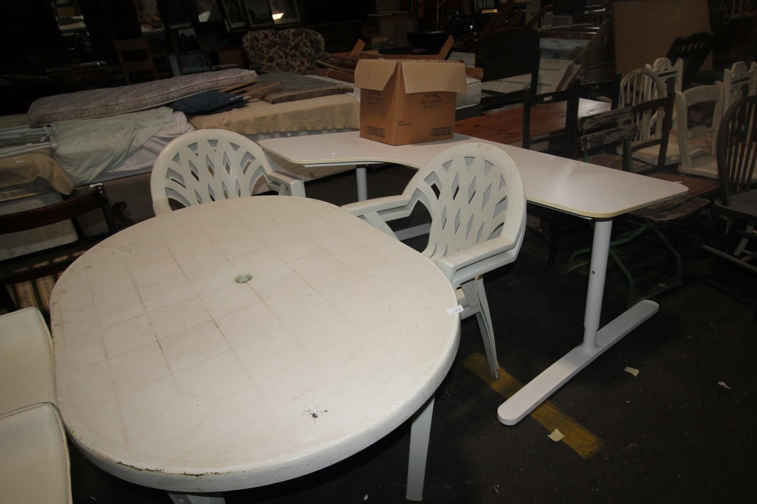 Lot 878: White upvc garden table with four matching chairs