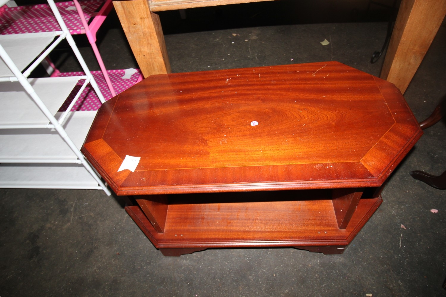 Lot 904: mahogany hexagon entertainment / tv table with shelf