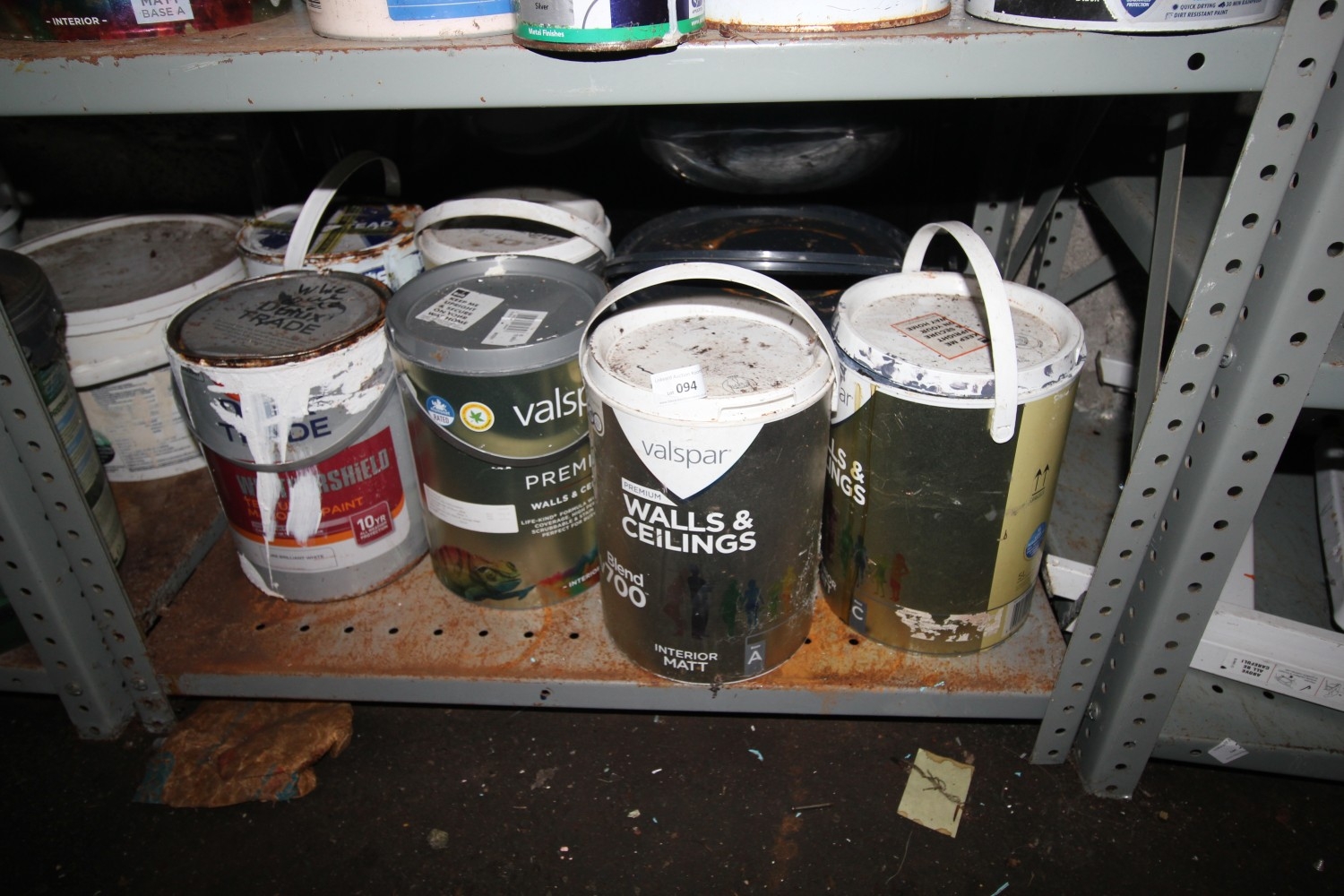 A full shelf of mixed paints – some full including Valspar 5L interior matt wall and ceiling paint etc.