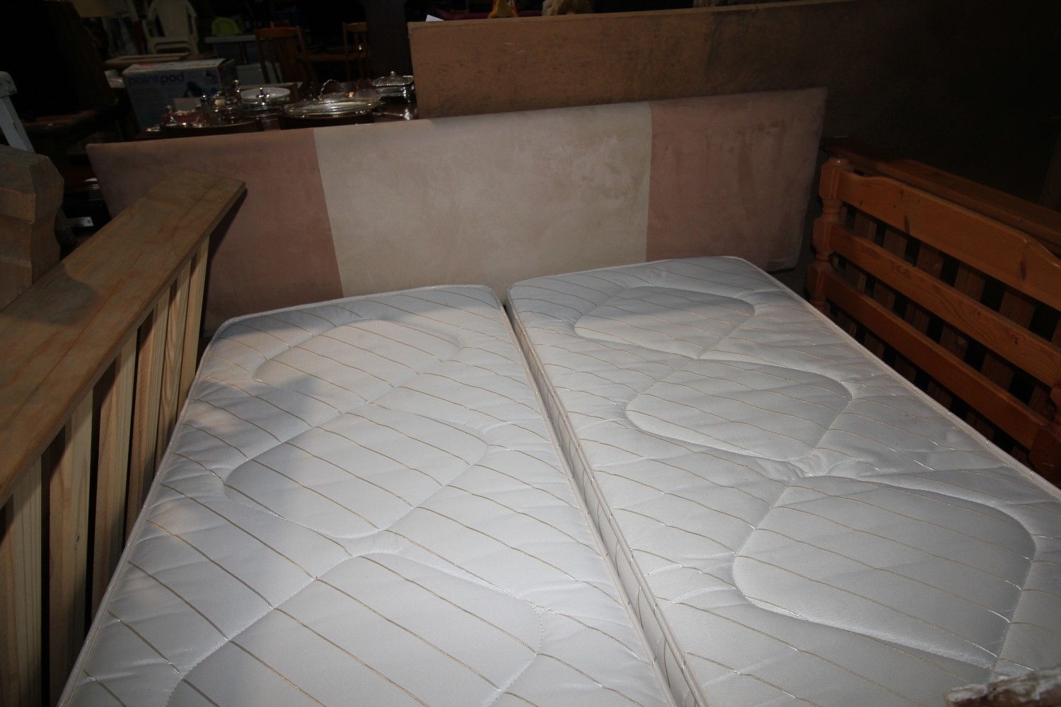 Kingsize bed with mattresses and suedette headboard