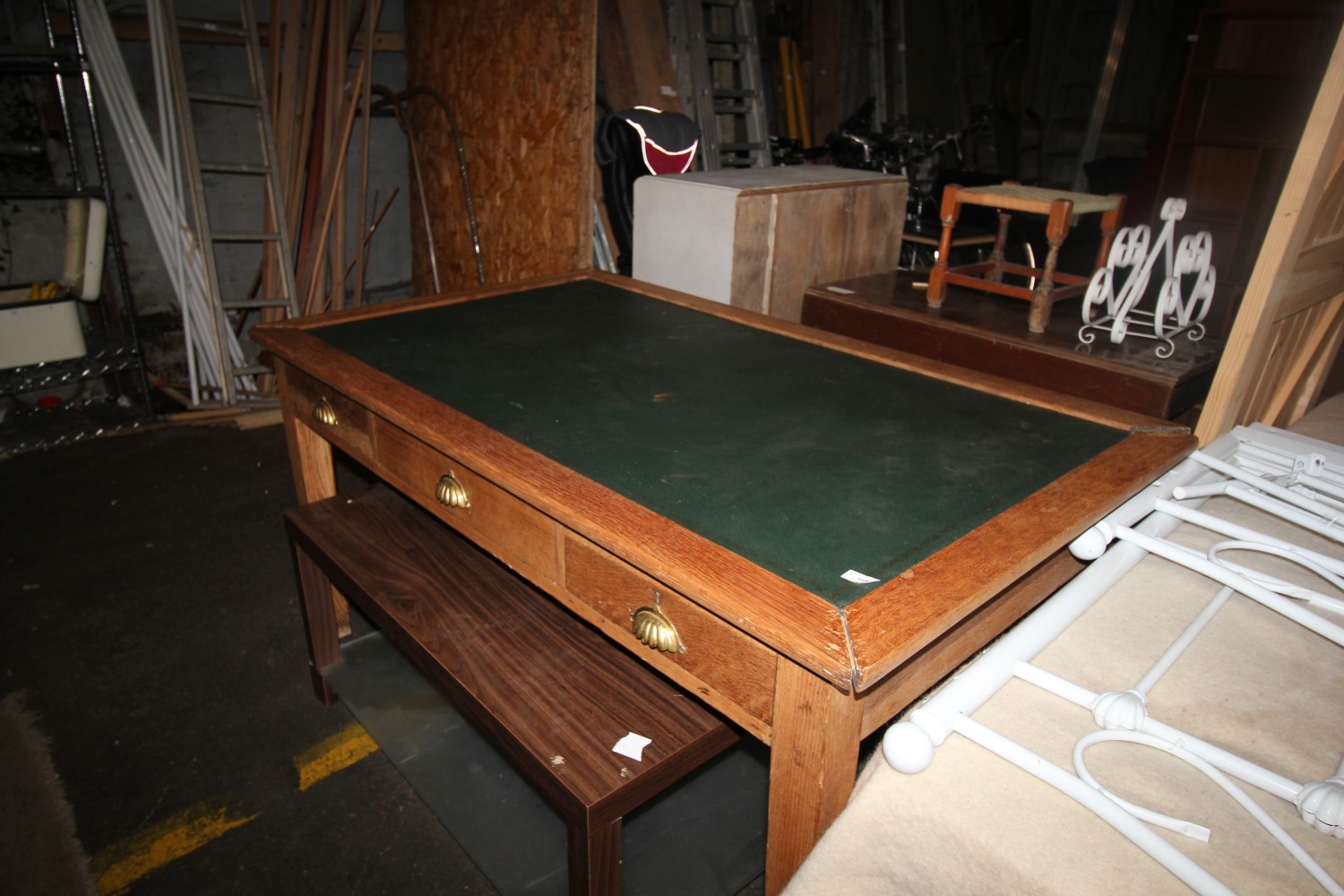 lovely 3 drawer green inlaid large stationary office table 155cm long by 192cm wide 176cm tall a/f